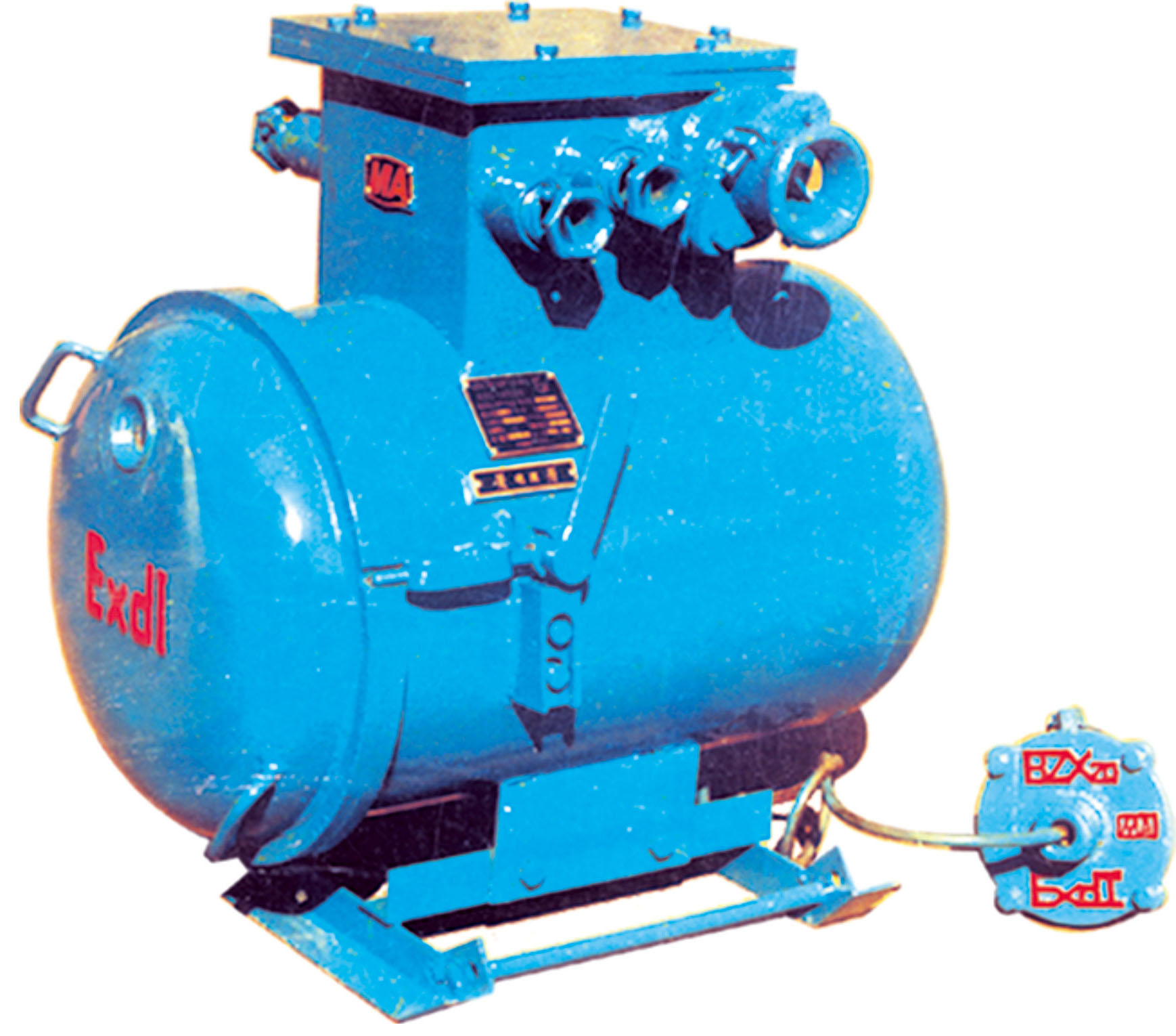 本綜合裝置主要由隔爆外殼、干式變壓器、機(jī)芯三部分組成。隔爆外殼為圓筒型,具有凸出的底和蓋,殼蓋與殼身采用轉(zhuǎn)蓋止口結(jié)構(gòu), 開啟方便。外殼上部有一接線箱作為引進(jìn)和引出的電纜用.外殼右側(cè)裝有操作隔離開關(guān)的手柄和檢查短路、漏電保護(hù)的試驗(yàn)按鈕,并有可靠的機(jī)械聯(lián)鎖裝置,殼蓋上方有觀察窗,可以從外面觀察指示燈狀態(tài)。機(jī)芯主要由控制變壓器、交流接觸器、直流繼電器以及電子插件等組成。干式變壓器與機(jī)芯的聯(lián)結(jié)采用端子板,檢修時(shí)機(jī)芯可獨(dú)立拿出。